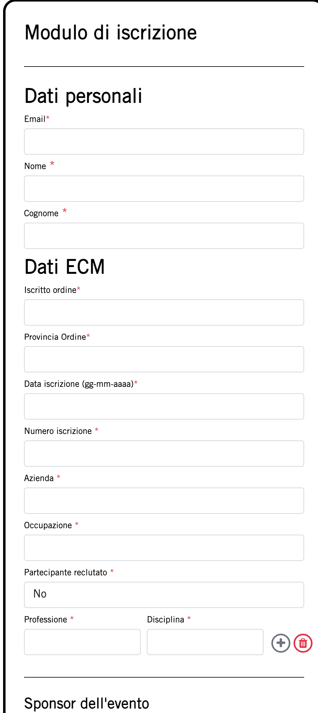 Utilizza la piattaforma Learning Objects per creare un modulo di registrazione online per i partecipanti. Questo modulo raccoglie tutte le informazioni necessarie, come l’anagrafica del medico o professionista, tutti i dati ECM necessari per lo svolgimento della formazione e l’attribuzione dei crediti previsti. E’ necessario anche indicare se il partecipante è stato reclutato o meno.